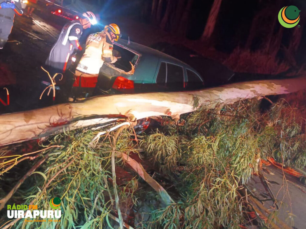 Segundo informações apuradas pelo repórter policial João Victor Lopes, a ocorrência envolveu um GM/Vectra e um VW/Golf, que colidiram contra uma árvore de grande porte caída sobre a rodovia.