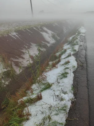 Temporal com queda de granizo, ventania e chuva forte atingiu o município de Tapera, no norte do RS, nesta quinta-feira (23). As pedras de gelo se acumularam às margens da RS-332, no início da tarde.