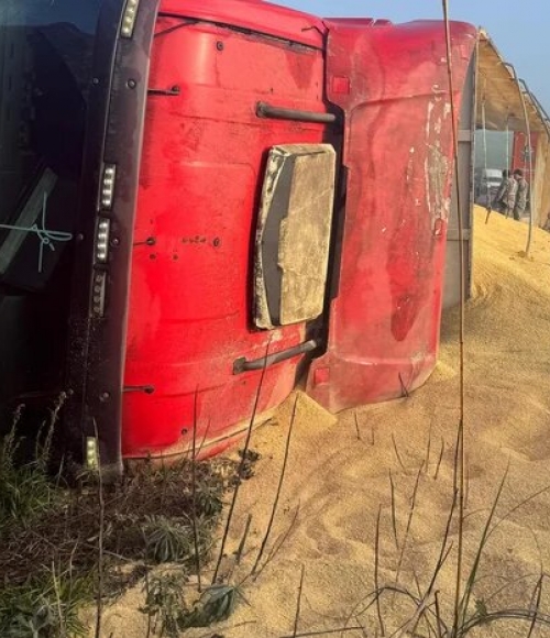 Caminhão de farelo de soja tomba na RS-463 e deixa trânsito em meia pista