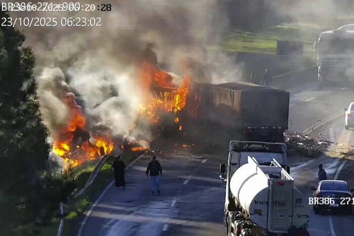 O trânsito está totalmente bloqueado na altura do km 272. A Polícia Rodoviária Federal (PRF) e o Corpo de Bombeiros atendem a ocorrência.