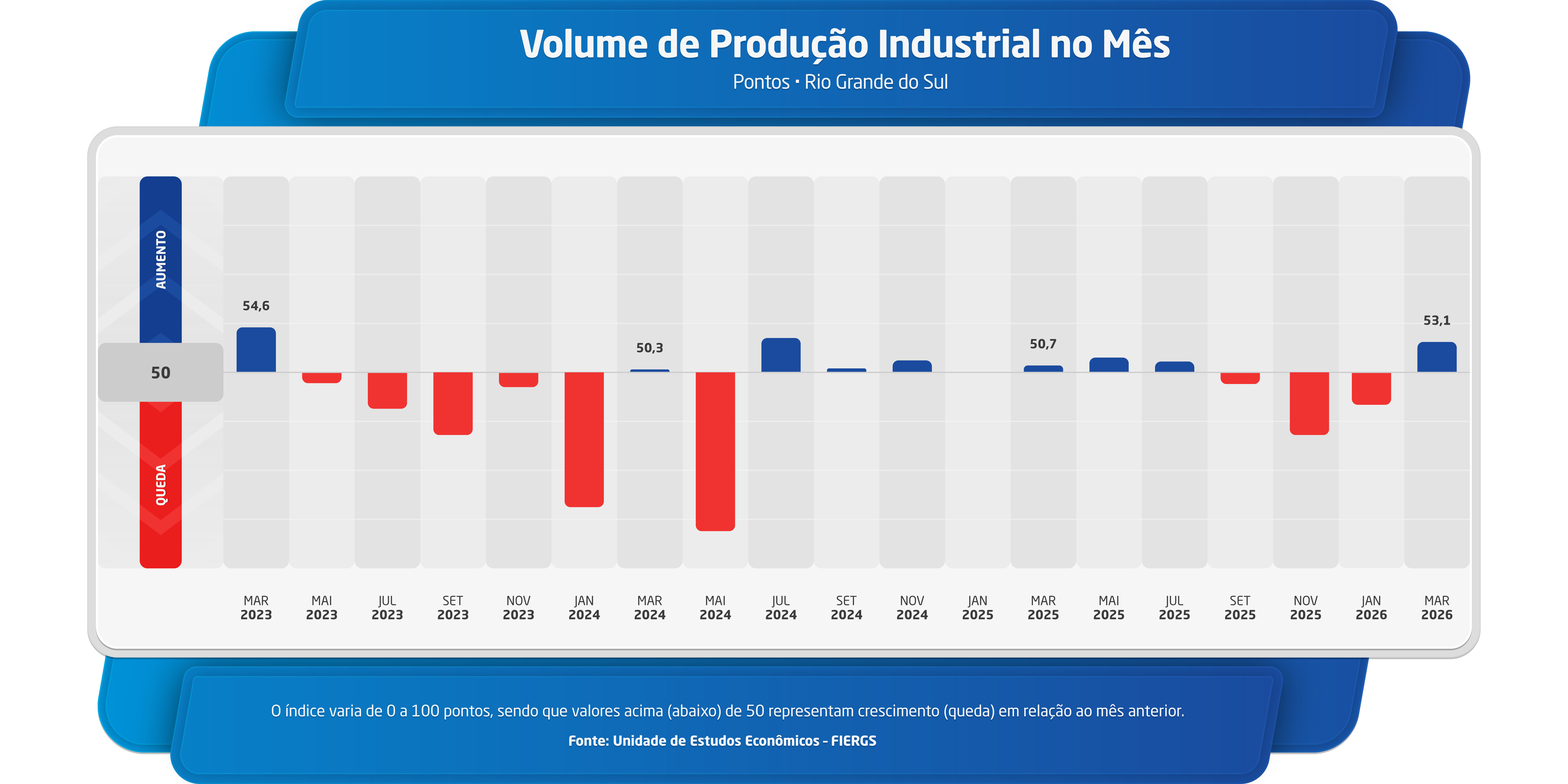 Porto Alegre, 29 de abril 2026 – A produção da indústria do Rio Grande do Sul voltou a crescer em março, após quatro meses consecutivos de queda. O índice avançou para 53,1 pontos, o que indica recuperação parcial da atividade produtiva, de acordo com a pesquisa Sondagem Industrial do RS, divulgada nesta quarta-feira (29) pelo Sistema FIERGS.