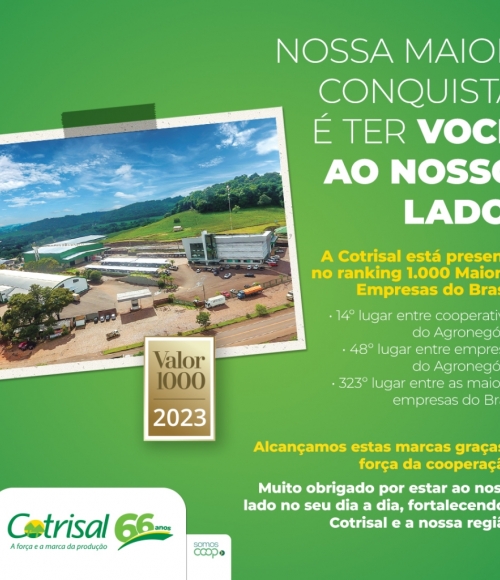 O bom desempenho da Cotrisal no ano de 2022 fez com que ela figurasse novamente no ranking do Anuário Valor Mil, uma das principais publicações especializadas no país sobre negócios e mercado.
